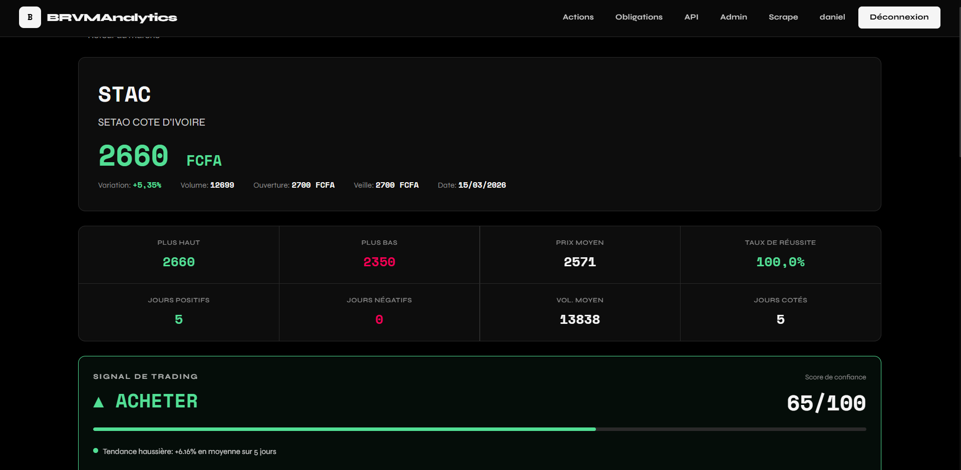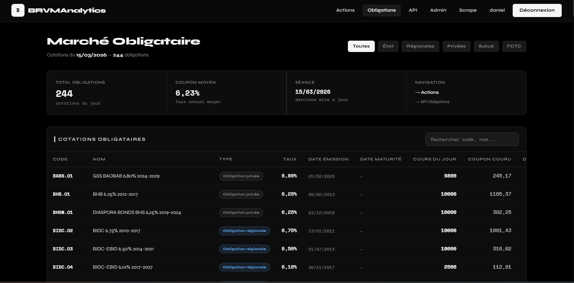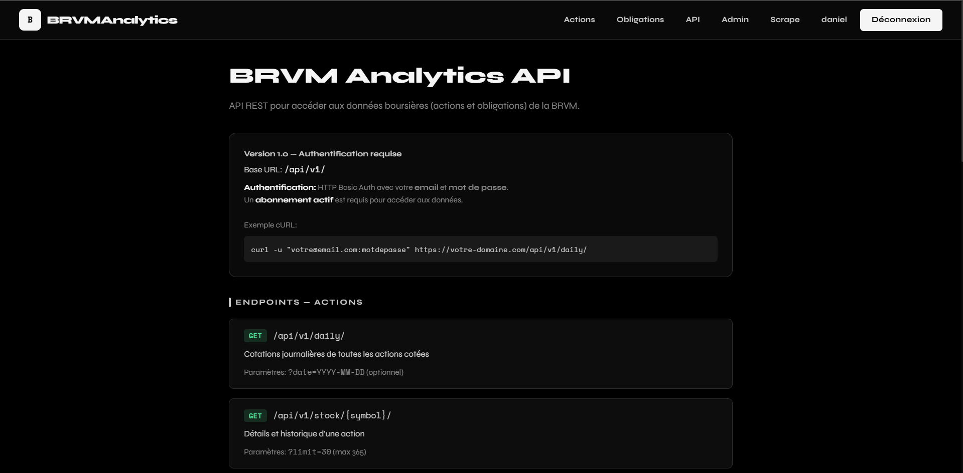 BRVMAnalytics est une plateforme web de suivi des marchés financiers de la BRVM. Elle centralise les cotations journalières des 47 actions cotées et des 244 obligations (État, régionales, privées, Sukuk, FCTC), les indices BRVM Composite et BRVM-30, ainsi que les tops et flops de séance. La plateforme expose également une API REST documentée permettant aux développeurs et institutions d'accéder programmatiquement aux données boursières (actions, obligations, résumé de marché) avec authentification et abonnement. Un module d'administration et de scraping automatise la collecte des données.